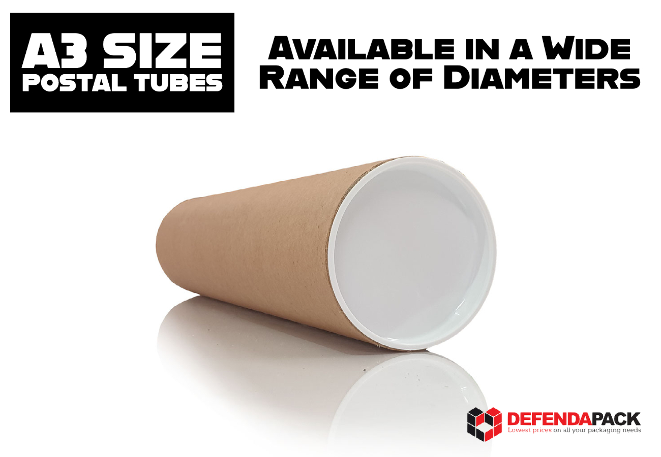 Strong Defenda A3 Postal Tubes. The most commonly used size Postal Tubes for A3 posters, artwork etc are 330mm long x 50mm diameter or 13″ x 2” in imperial size with a 1.5mm wall. These tubes provide a high degree of protection and a reasonable size diameter to prevent curling of the contents.