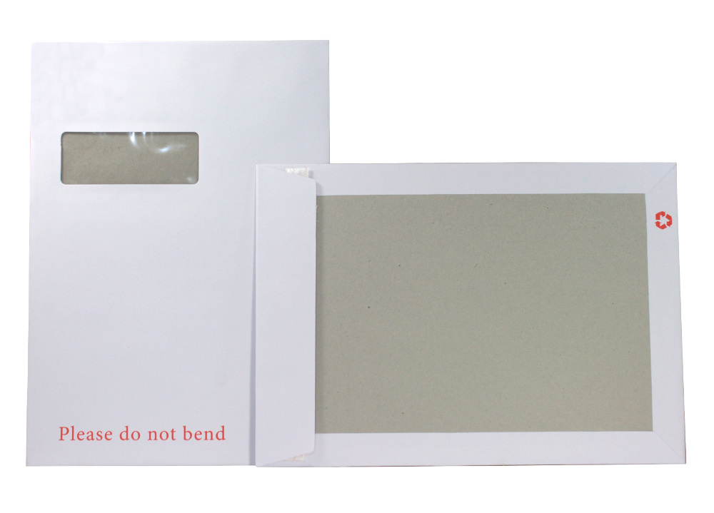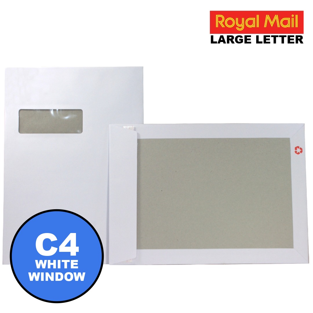 Often referred to as window white C4 A4 card backed envelopes, window C4 A4 white hard back envelopes or window white C4 A4 board back envelopes.