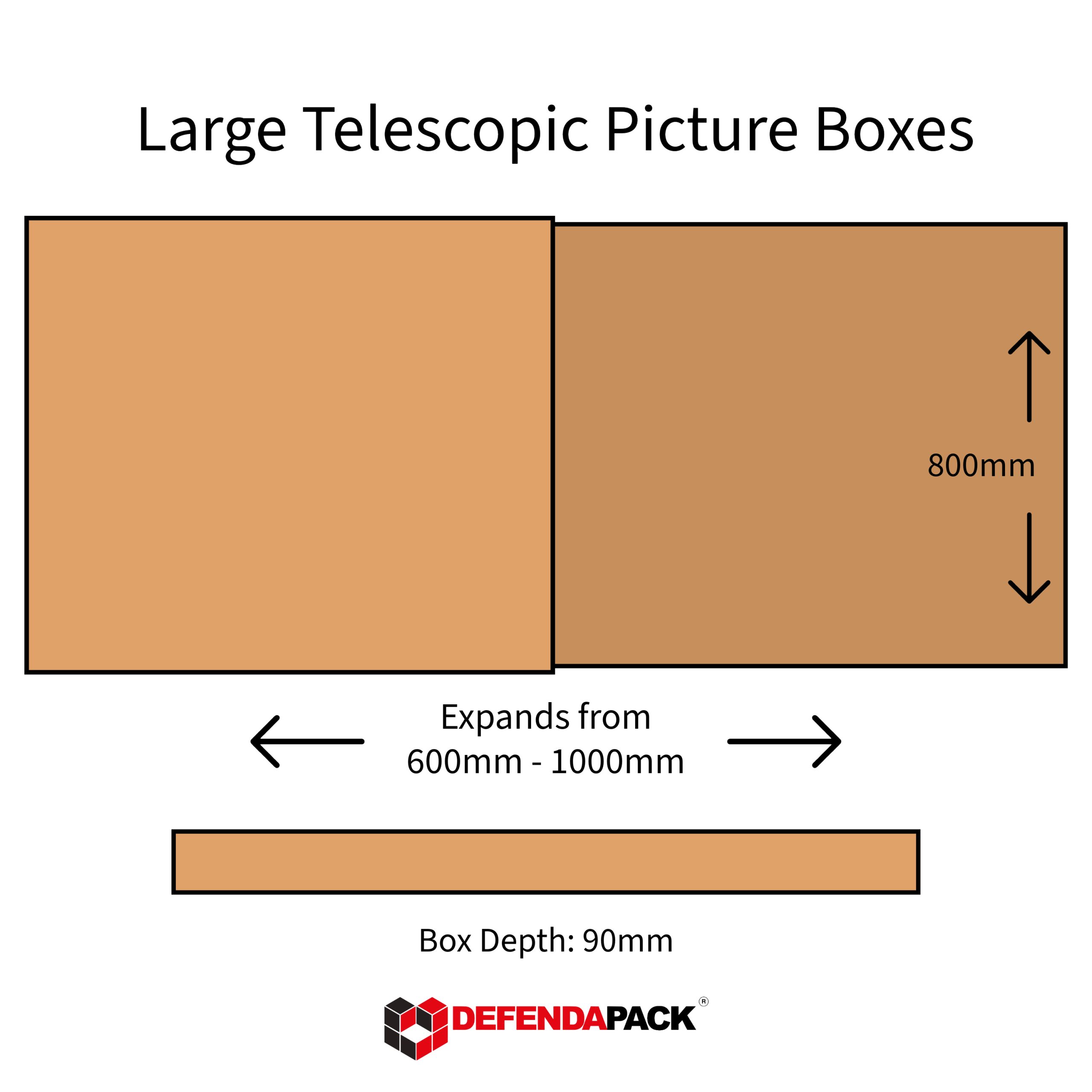 These extremely handy telescopic picture postal boxes allow users to adjust the size of their packaging to their particular picture or painting. Manufactured in the UK in a strong durable 125K/125T BC Flute Double Wall corrugated cardboard, these amazing extendable packing boxes will offer you the ultimate protection for a vast range of picture sizes.